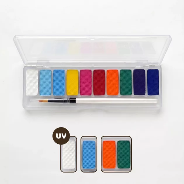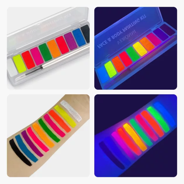 Brilho Intenso - Veja rostos e mãos brilharem sob luzes UV. Cada aplicação oferece uma radiação neon impressionante para cada comemoração.