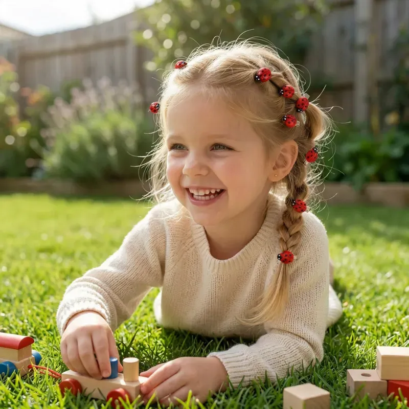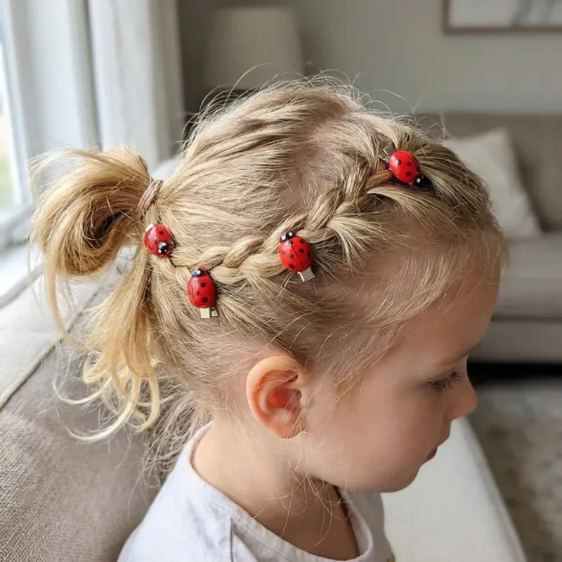 Alegria Instantânea - Formatos coloridos de joaninha transformam tranças simples em histórias mágicas. Reações felizes aparecem imediatamente, tornando fotos, festas e passeios ainda mais especiais.