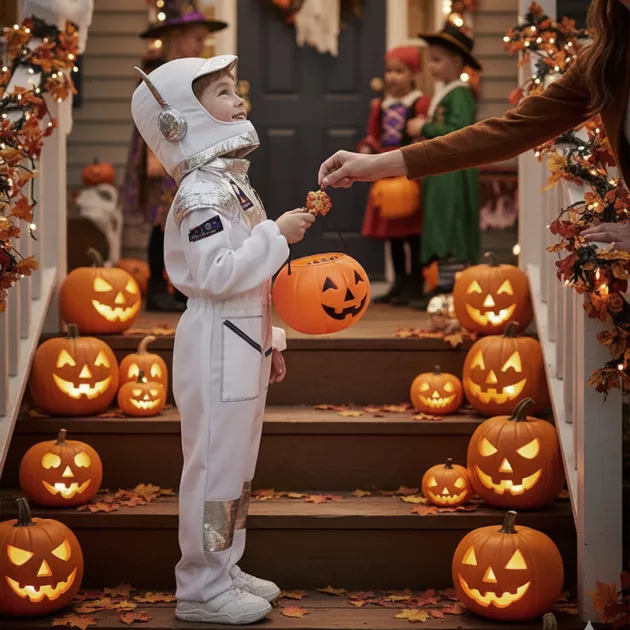 Nossa foto de família ficou incrível com meu filho vestido de astronauta! Os detalhes brilhantes deixaram tudo ainda mais divertido para o Halloween.