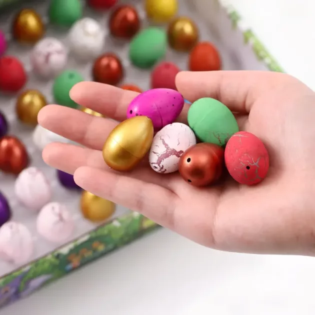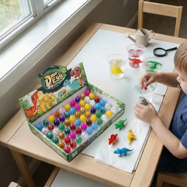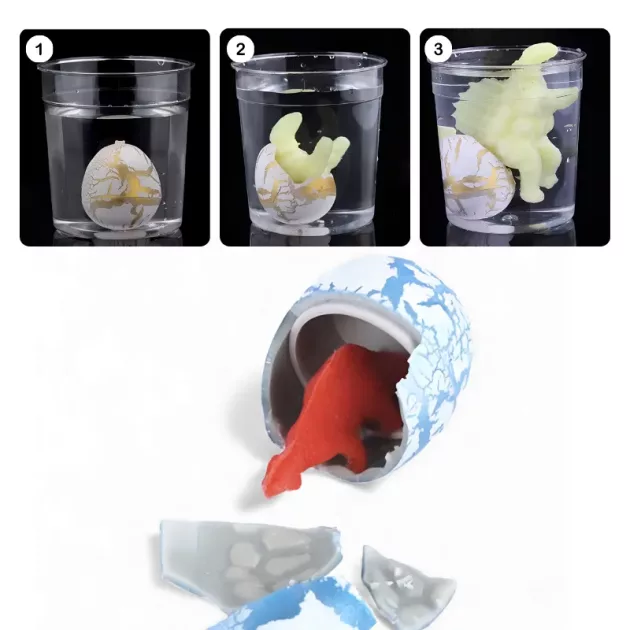 Esses ovos são incríveis! Adicionamos água e vimos os mini dinossauros saírem. Meus amigos e eu nos revezamos para pegar as cascas, rindo a cada vez.