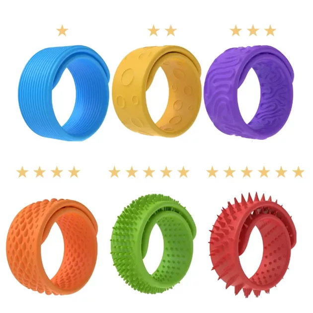 Apoie facilmente a concentração do seu filho onde quer que ele vá. Essas pulseiras coloridas de silicone proporcionam um toque divertido e calmante para mãos inquietas. Cada peça flexível possui um padrão único para uma sensorial agradável. Fáceis de usar e seguras para o uso diário, ajudam as crianças a se sentirem confortáveis em momentos agitados.