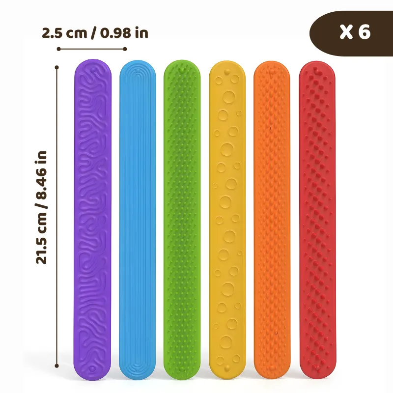 Apoie facilmente a concentração do seu filho onde quer que ele vá. Essas pulseiras coloridas de silicone proporcionam um toque divertido e calmante para mãos inquietas. Cada peça flexível possui um padrão único para uma sensorial agradável. Fáceis de usar e seguras para o uso diário, ajudam as crianças a se sentirem confortáveis em momentos agitados.