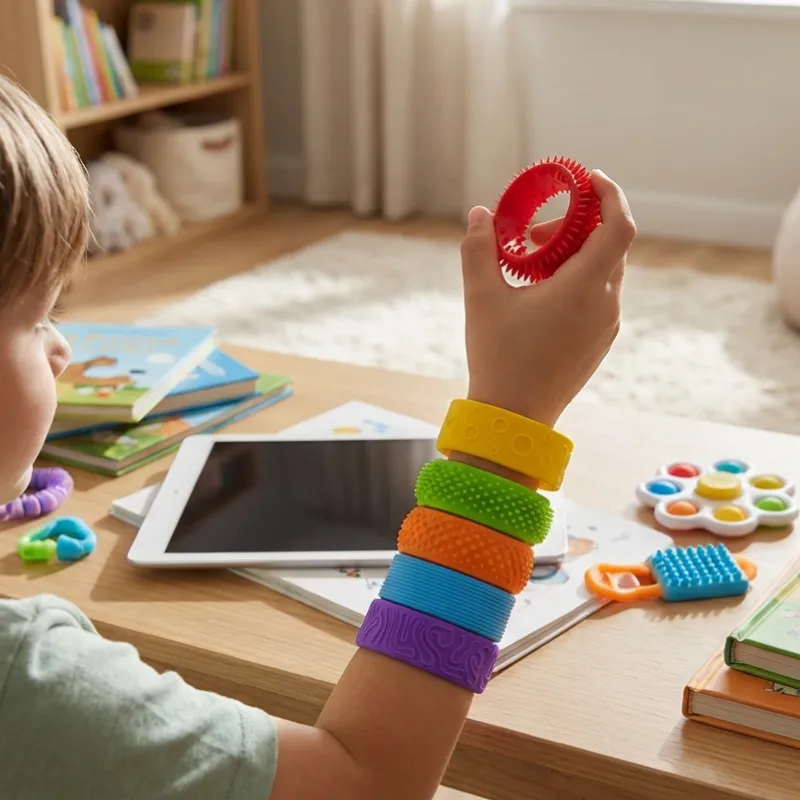 Meu sobrinho não consegue parar de brincar com essas pulseiras! Ele coloca e tira o tempo todo e isso acalma suas mãos.