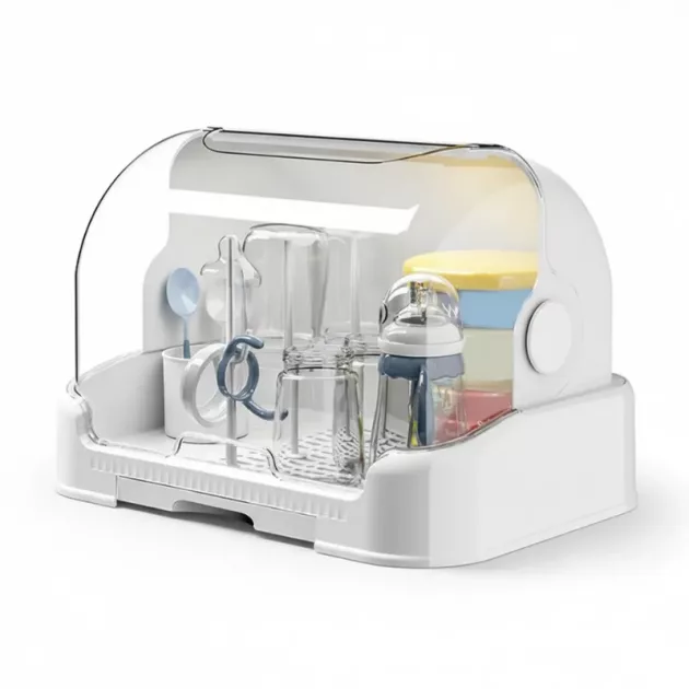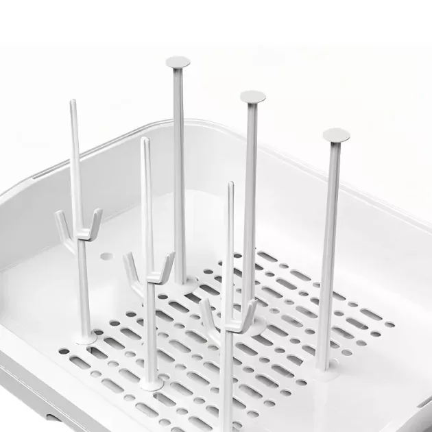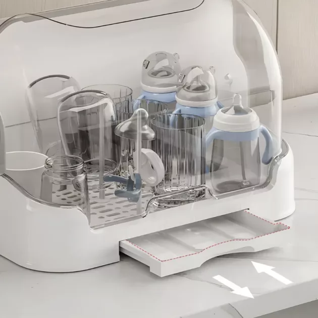 Fica bem ao lado da pia e economiza espaço na bancada. Além disso, as mamadeiras estão sempre prontas para as mamadas noturnas.