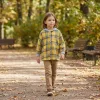 Esta camisa xadrez é nossa escolha para manhãs corridas. Meu filho coloca por cima de uma camiseta e sempre fica fofo e confortável.