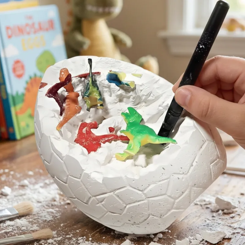Meu irmãozinho passou horas escavando fósseis do ovo de dinossauro. Ele ficou super animado a cada peça nova que encontrava, e eu adorei vê-lo aprender.