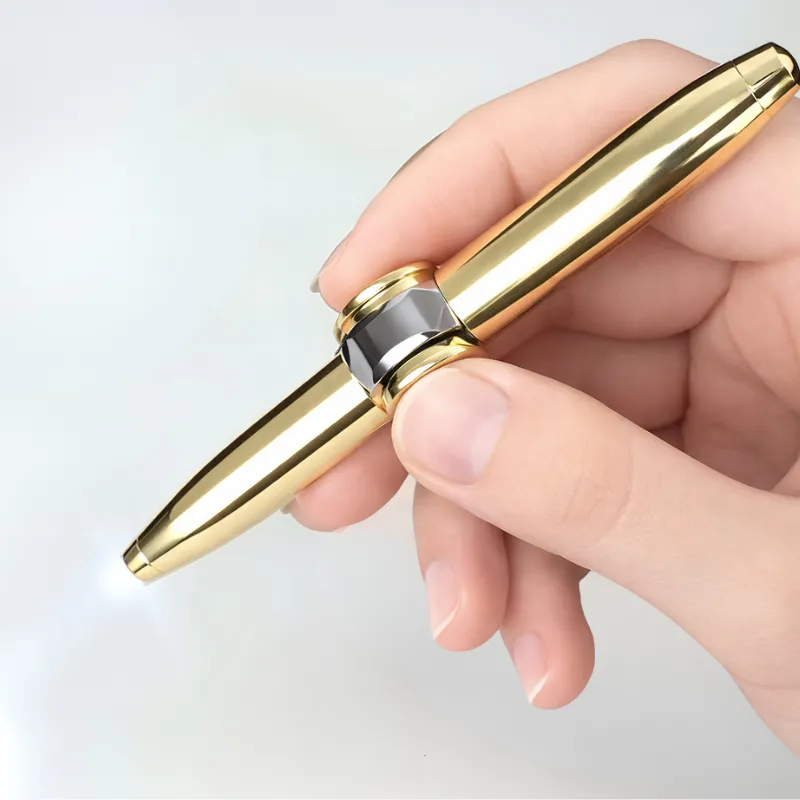 Fico menos distraída nas aulas desde que peguei essa caneta. Girá-la me impede de ficar batucando na mesa o tempo todo. O LED é divertido!