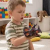 O fantoche se dobra para caber na minha mão grande e na mão pequena do meu filho. Revezamos os turnos e criamos vozes engraçadas juntos, o que é realmente especial.