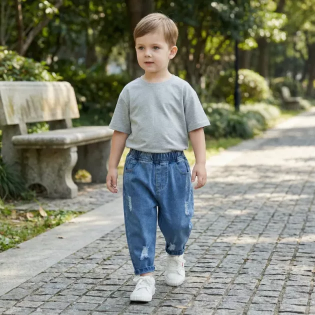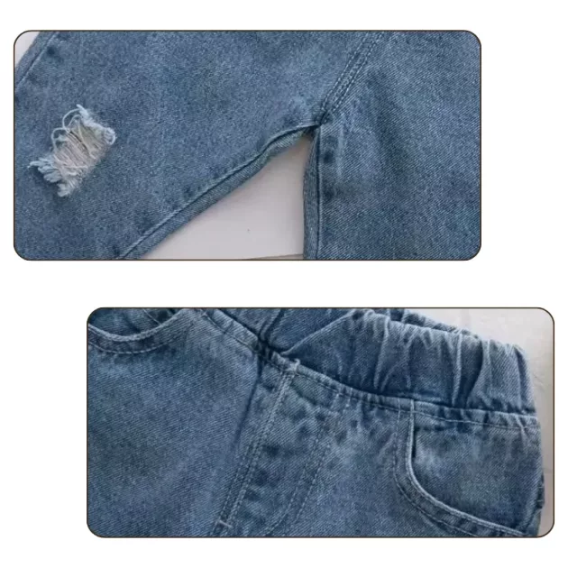 O jeans é super confortável e me deixa correr por aí sem apertar. Os rasgos estilosos fazem dele meu favorito para brincar lá fora!